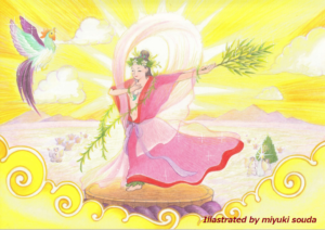 その古事記を学ぶ会のメンバーに絵描きさんがおりまして、 開業する前、 何か飾るのに縁起のよい神様の絵を描いてもらいたいと思い、 古事記にも登場するアマノウズメノミコトという神様(弟のスサノオノミコトの横暴に反省して、岩屋戸に閉じ籠ったアマテラスオオミカミを踊りで引き出した巫女さんで、 古事記を読みならわした稗田阿礼の祖先神でもあります) が好きで、古事記の原文を紐解きながら忠実にかつオリジナルの創造も加えて、 描いてもらっていました。